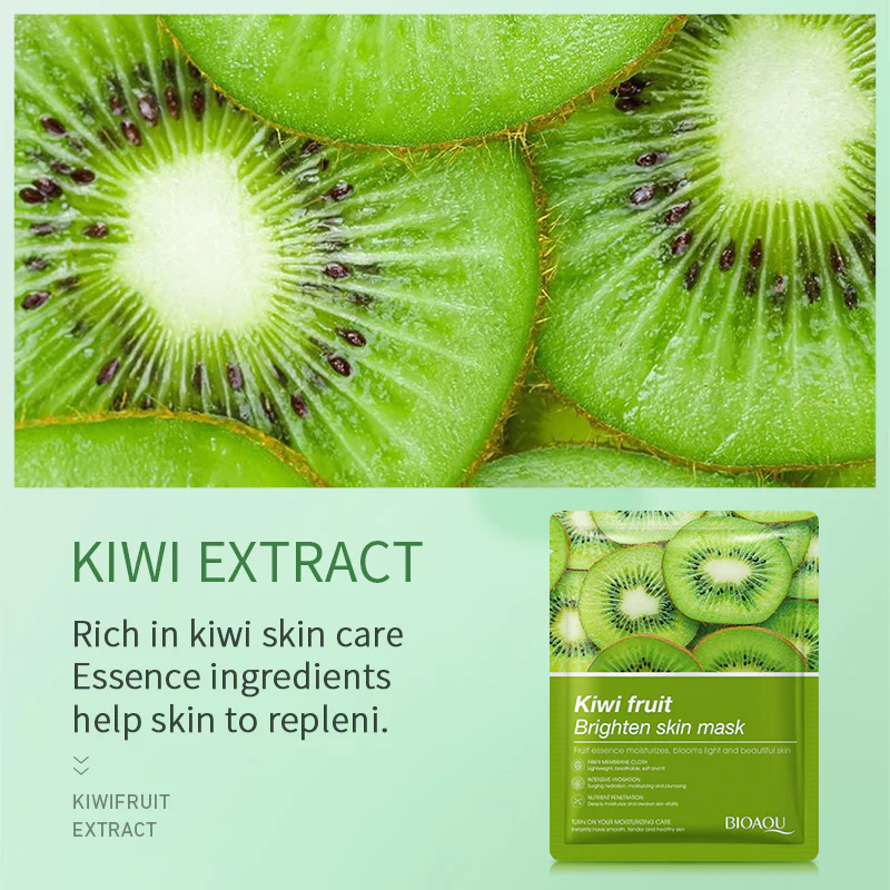 ماسک ورقه ای کیوی بیوآکوا سرشار از عصاره طبیعی میوه کیوی بوده که این میوه یکی از مفید ترین و پر فایده ترین میوه ها برای پوست شما می باشد.